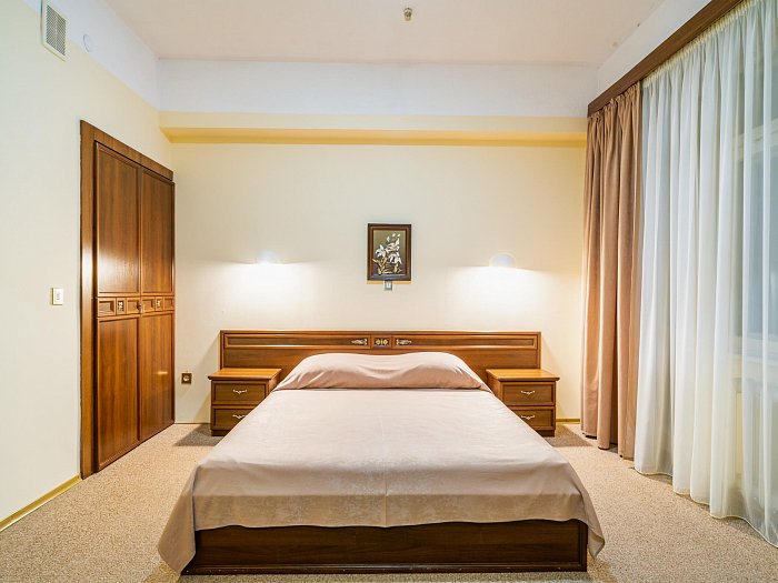 В номере: две комнаты: спальня и гостиная, односпальные кровати или одна двуспальная, прикроватные тумбы, зеркало, шкаф для одежды, мягкая мебель, журнальный стол, сейф, письменный стол, телевизор, кондиционер, фен, холодильник, Wi-Fi