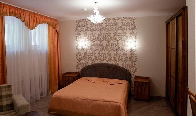 В номере: кровать двуспальная, прикроватные тумбочки, шкаф, мягкая мебель, телевизор, холодильник, чайный набор посуды